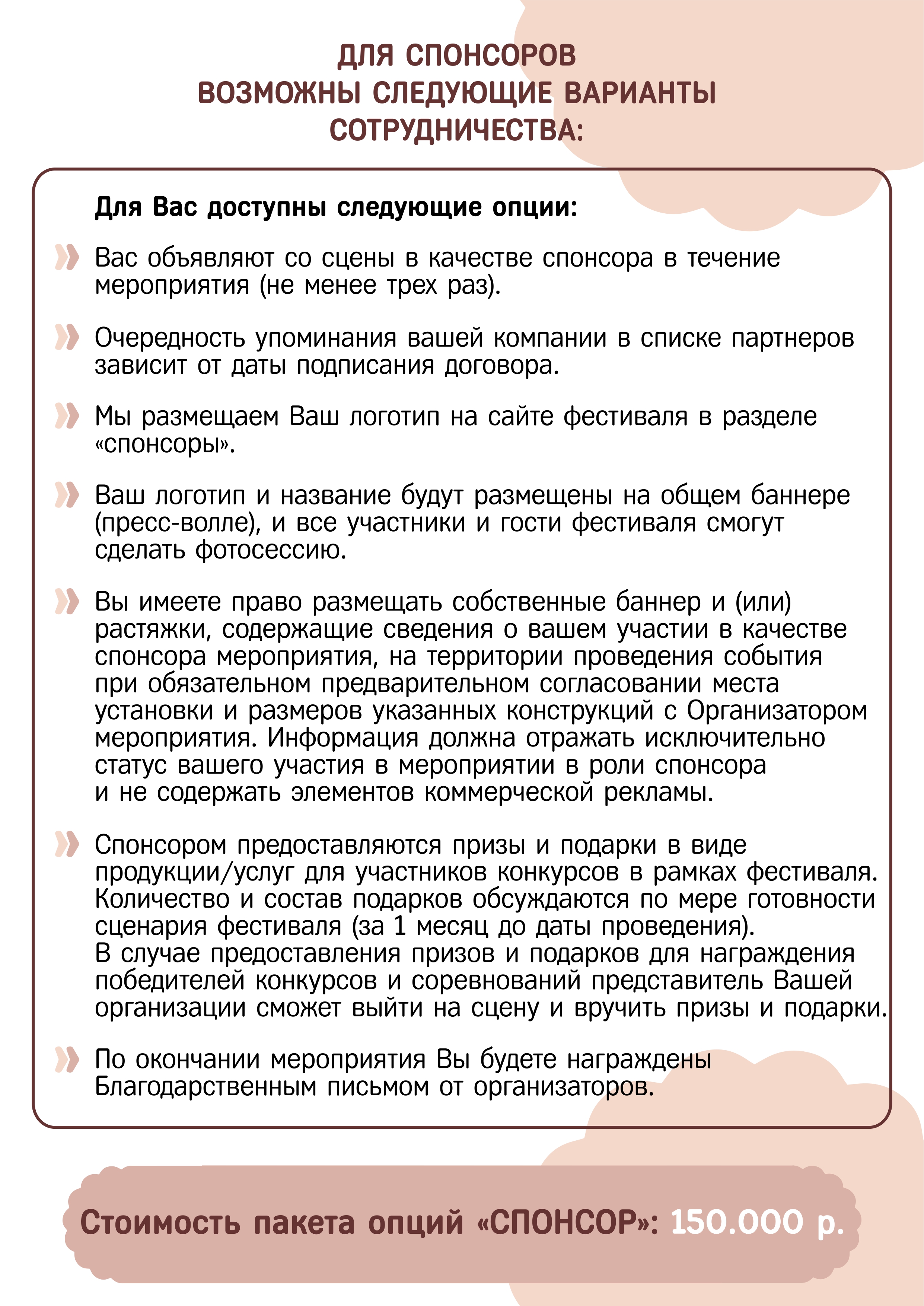 Мы готовы обсудить индивидуальные условия, соответствующие вашим маркетинговым задачам: интеграция в конкретные активности, со-брендинг сувенирной продукции, эксклюзивное участие в шоу-программе и т.д.
